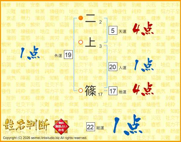生活面を象徴する運勢です。外部から受ける影響力を表し、結婚運、家庭運や職場、環境への順応性を表します。総運から人運を引いた画数。姓や名が1文字の場合を除く。