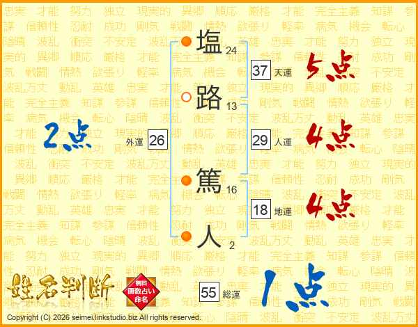 家系が持つ宿命的な運勢を表します。祖先から受け継いだ苗字ですので自分の力が及びません。家柄を象徴します。苗字の合計画数。