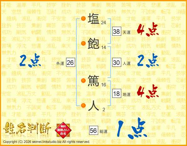 塩(24画)飽(14画) 篤(16画)人(2画)