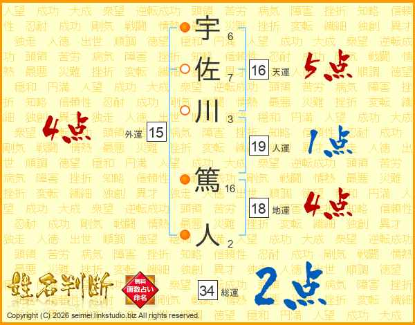 宇(6画)佐(7画)川(3画) 篤(16画)人(2画)