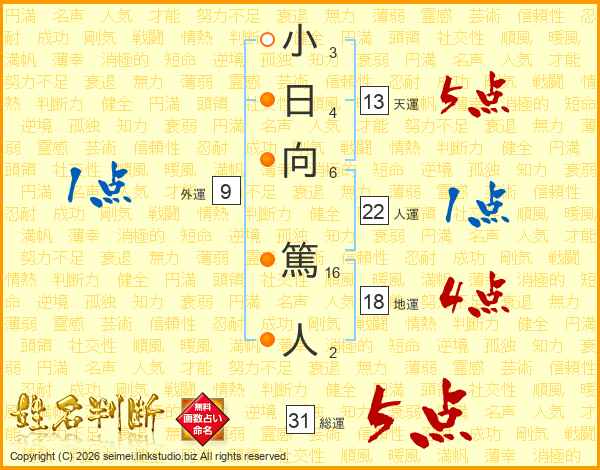 生活面を象徴する運勢です。外部から受ける影響力を表し、結婚運、家庭運や職場、環境への順応性を表します。総運から人運を引いた画数。姓や名が1文字の場合を除く。