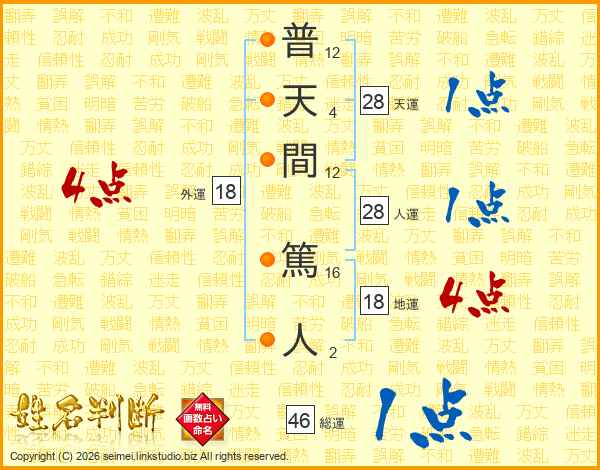 普(12画)天(4画)間(12画) 篤(16画)人(2画)