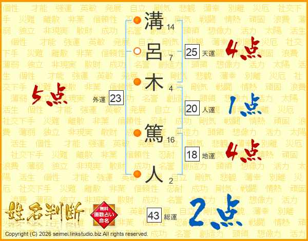 生活面を象徴する運勢です。外部から受ける影響力を表し、結婚運、家庭運や職場、環境への順応性を表します。総運から人運を引いた画数。姓や名が1文字の場合を除く。
