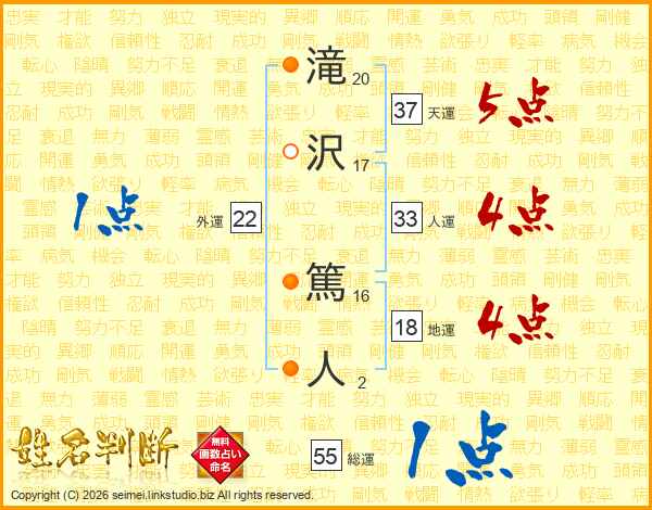 滝(20画)沢(17画) 篤(16画)人(2画)