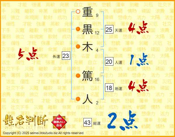 重(9画)黒(12画)木(4画) 篤(16画)人(2画)