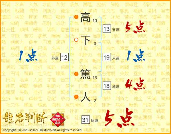生活面を象徴する運勢です。外部から受ける影響力を表し、結婚運、家庭運や職場、環境への順応性を表します。総運から人運を引いた画数。姓や名が1文字の場合を除く。