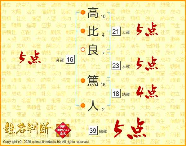 高比良篤人さんの総運は39画の5点!