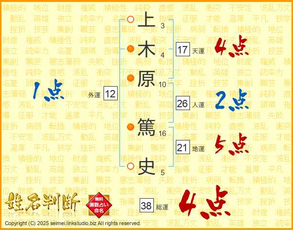 上木原篤史さんの総運は38画の4点!