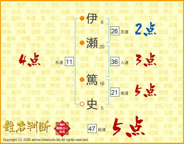 伊(6画)瀬(20画) 篤(16画)史(5画)