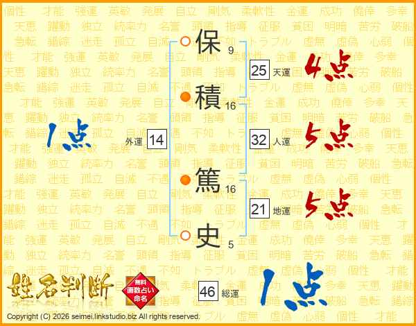 保(9画)積(16画) 篤(16画)史(5画)
