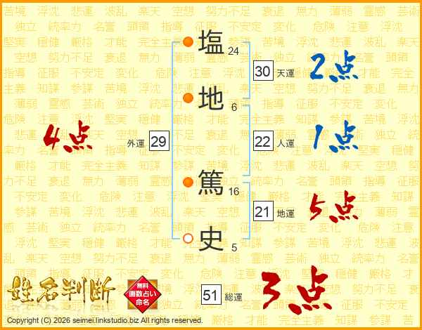 塩(24画)地(6画) 篤(16画)史(5画)