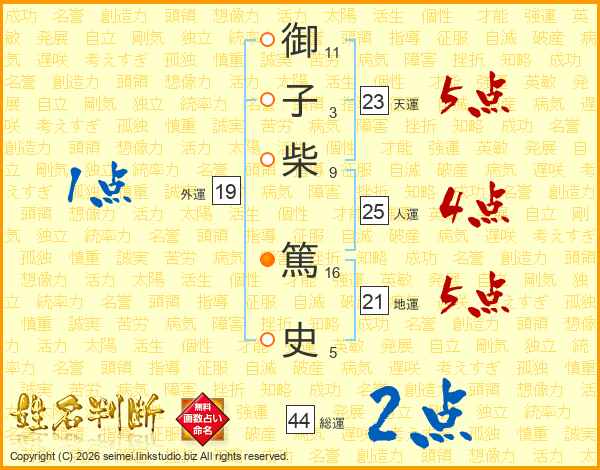 御(11画)子(3画)柴(9画) 篤(16画)史(5画)