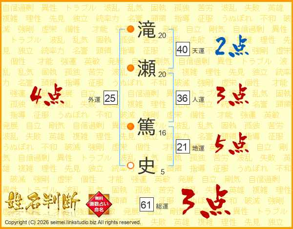 滝(20画)瀬(20画) 篤(16画)史(5画)