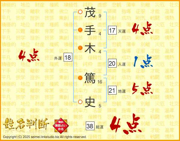 茂(9画)手(4画)木(4画) 篤(16画)史(5画)