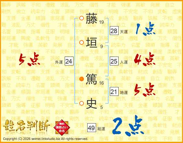 藤(19画)垣(9画) 篤(16画)史(5画)