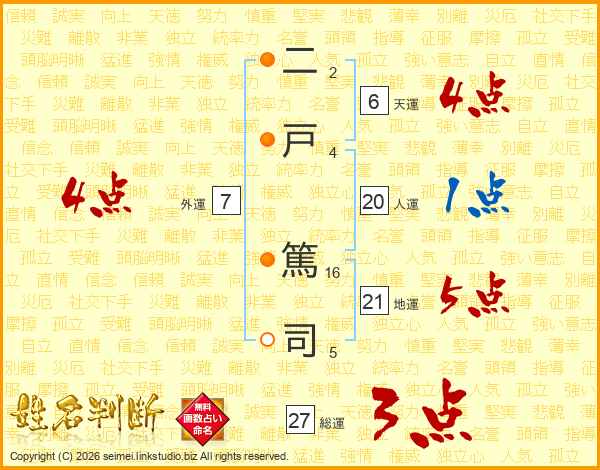 二(2画)戸(4画) 篤(16画)司(5画)
