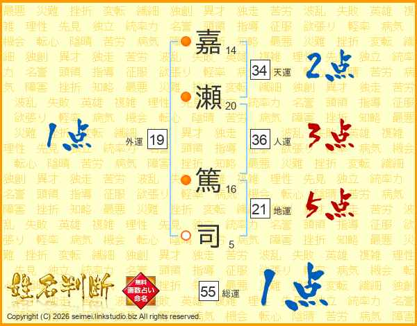 嘉(14画)瀬(20画) 篤(16画)司(5画)