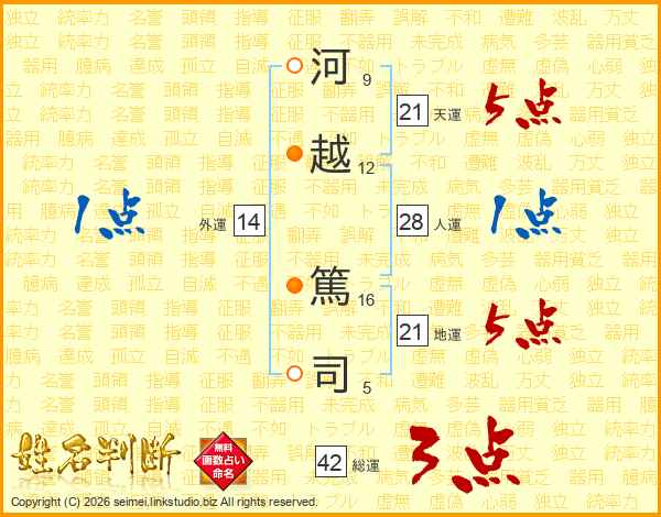 生活面を象徴する運勢です。外部から受ける影響力を表し、結婚運、家庭運や職場、環境への順応性を表します。総運から人運を引いた画数。姓や名が1文字の場合を除く。