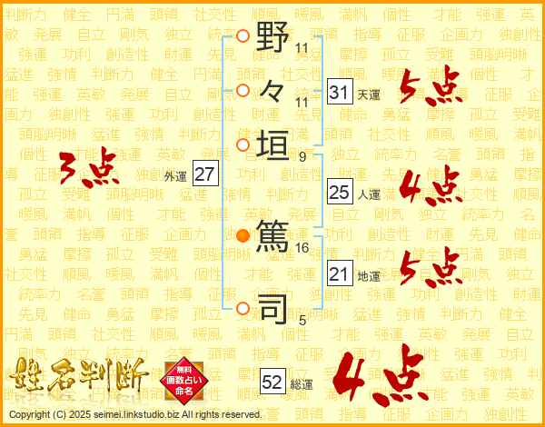 野(11画)々(11画)垣(9画) 篤(16画)司(5画)