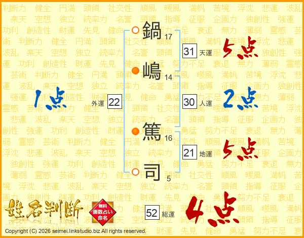 鍋(17画)嶋(14画) 篤(16画)司(5画)