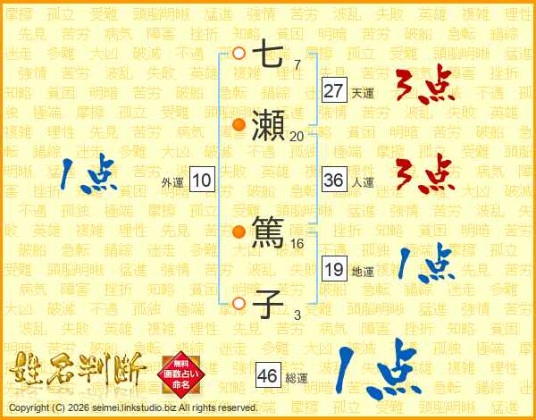 七(7画)瀬(20画) 篤(16画)子(3画)