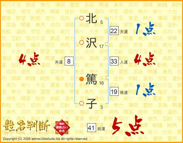 北(5画)沢(17画) 篤(16画)子(3画)
