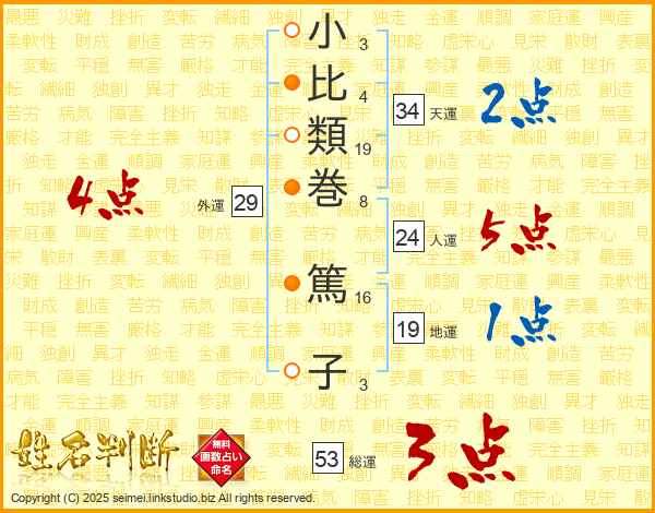小(3画)比(4画)類(19画)巻(8画) 篤(16画)子(3画)