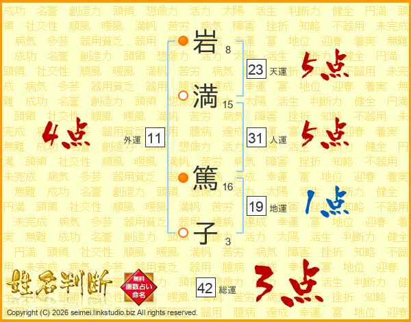 生活面を象徴する運勢です。外部から受ける影響力を表し、結婚運、家庭運や職場、環境への順応性を表します。総運から人運を引いた画数。姓や名が1文字の場合を除く。