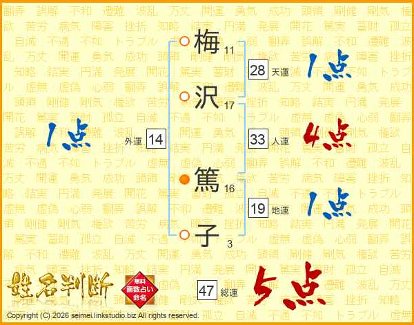 梅(11画)沢(17画) 篤(16画)子(3画)
