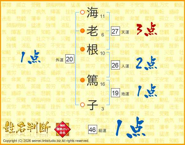 海(11画)老(6画)根(10画) 篤(16画)子(3画)
