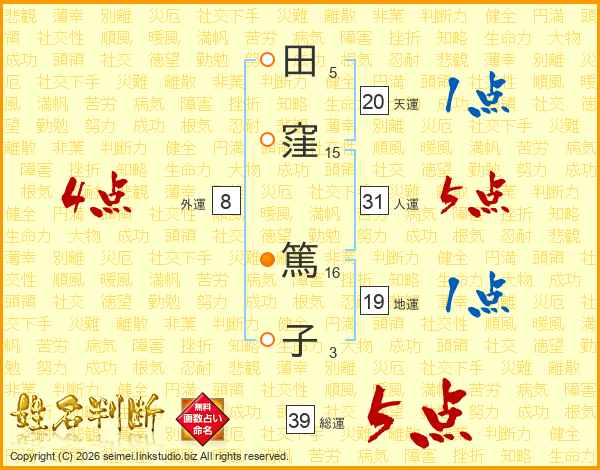 生活面を象徴する運勢です。外部から受ける影響力を表し、結婚運、家庭運や職場、環境への順応性を表します。総運から人運を引いた画数。姓や名が1文字の場合を除く。