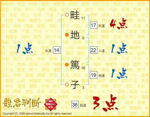 生活面を象徴する運勢です。外部から受ける影響力を表し、結婚運、家庭運や職場、環境への順応性を表します。総運から人運を引いた画数。姓や名が1文字の場合を除く。