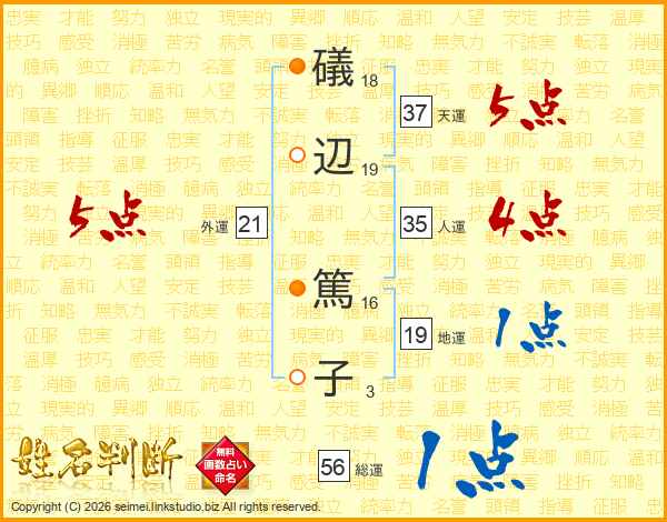 礒(18画)辺(19画) 篤(16画)子(3画)