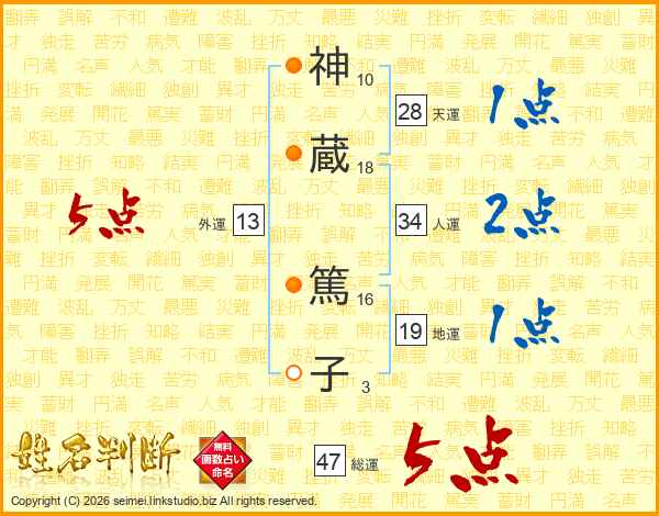 神(10画)蔵(18画) 篤(16画)子(3画)
