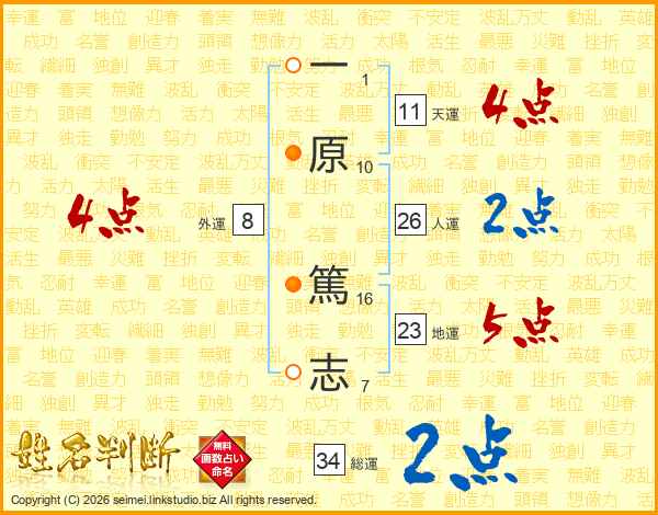 あなたの人生を表す1番重要な運勢です。生涯を通じて影響する総合運となり、主に50歳以降の晩年期に影響を及ぼします。苗字と名前の合計画数。