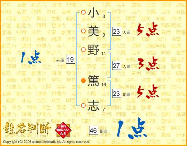 小(3画)美(9画)野(11画) 篤(16画)志(7画)