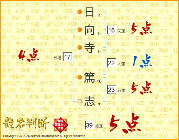 日(4画)向(6画)寺(6画) 篤(16画)志(7画)