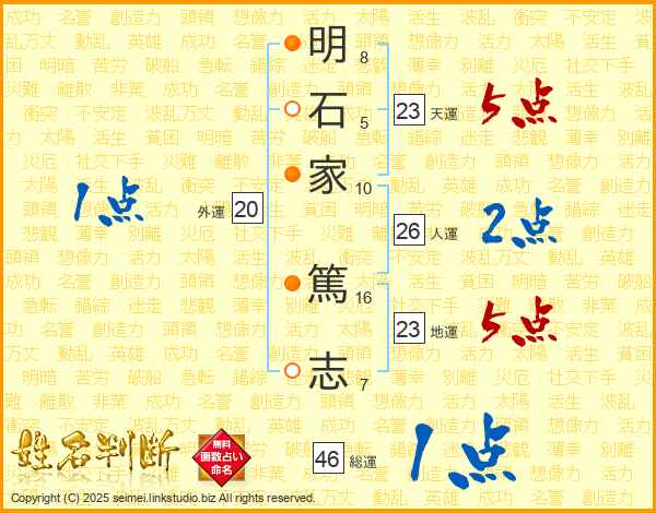 明(8画)石(5画)家(10画) 篤(16画)志(7画)