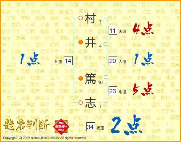 村(7画)井(4画) 篤(16画)志(7画)