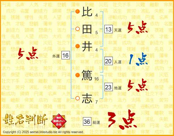 比(4画)田(5画)井(4画) 篤(16画)志(7画)
