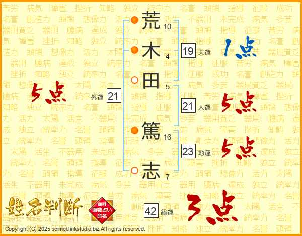 荒(10画)木(4画)田(5画) 篤(16画)志(7画)