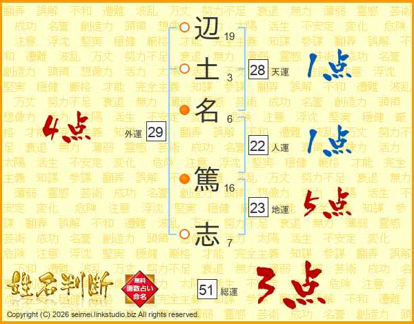 辺(19画)土(3画)名(6画) 篤(16画)志(7画)