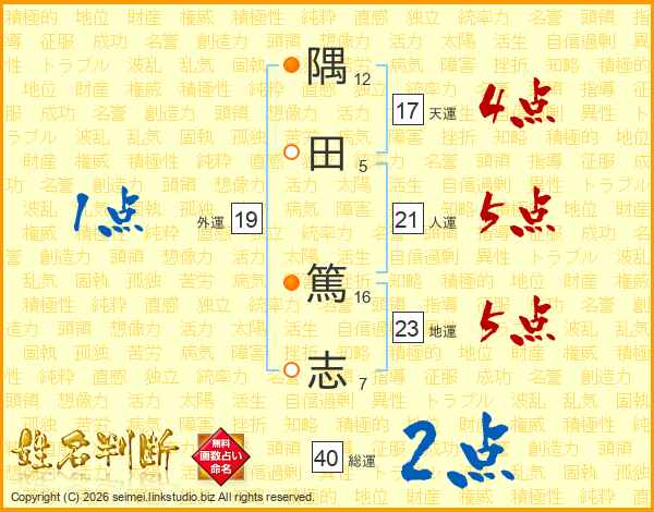 生活面を象徴する運勢です。外部から受ける影響力を表し、結婚運、家庭運や職場、環境への順応性を表します。総運から人運を引いた画数。姓や名が1文字の場合を除く。