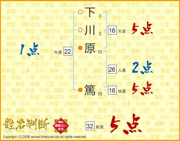 下川原篤さんの総運は32画の5点!