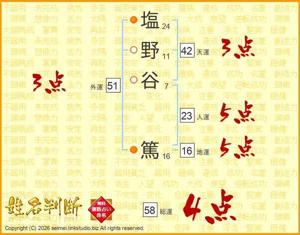 塩野谷篤さんの総運は58画の4点!