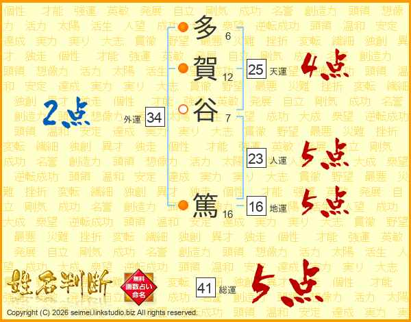 多賀谷篤さんの総運は41画の5点!