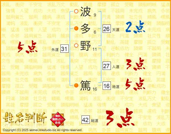 生活面を象徴する運勢です。外部から受ける影響力を表し、結婚運、家庭運や職場、環境への順応性を表します。総運から人運を引いた画数。姓や名が1文字の場合を除く。