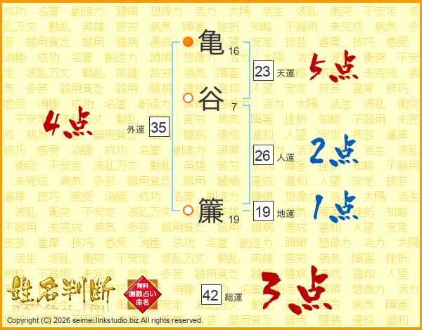 亀谷簾さんの天運は23画の5点!