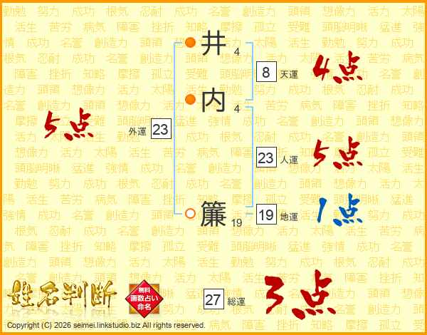 生活面を象徴する運勢です。外部から受ける影響力を表し、結婚運、家庭運や職場、環境への順応性を表します。総運から人運を引いた画数。姓や名が1文字の場合を除く。