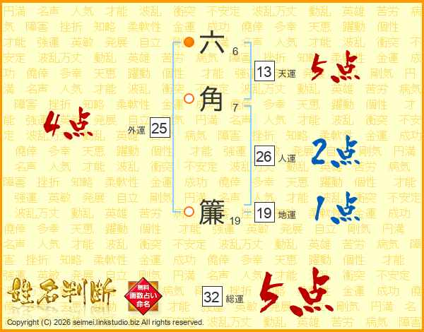 あなたの人生を表す1番重要な運勢です。生涯を通じて影響する総合運となり、主に50歳以降の晩年期に影響を及ぼします。苗字と名前の合計画数。